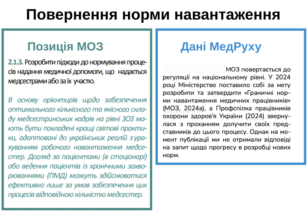 Водночас раніше на прямі запитання МедРуху до МОЗ про те, до яких норм навантаження можуть апелювати медсестри, аби захиститись від експлуатації, відомство відповідало, що “скасування наказу No33 дало більшу автономію в прийнятті рішень керівниками закладів охорони здоров’я щодо формування та затвердження штатних розписів таких закладів виходячи з їхньої функції та обсягу медичної допомоги, що пов’язано з реформою фінансування медичної системи України.