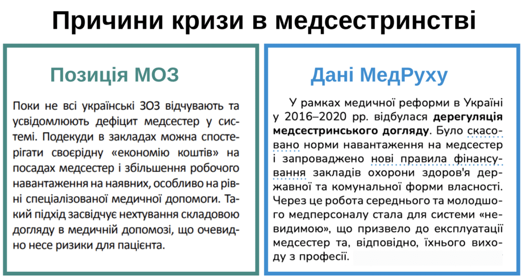 Водночас дослідження МедРуху підкреслює, що масовий вихід медсестер з професії передусім повʼязаний з дерегуляцією медсестринського догляду після скасування норм навантаження та введення нових правил фінансування лікарень.