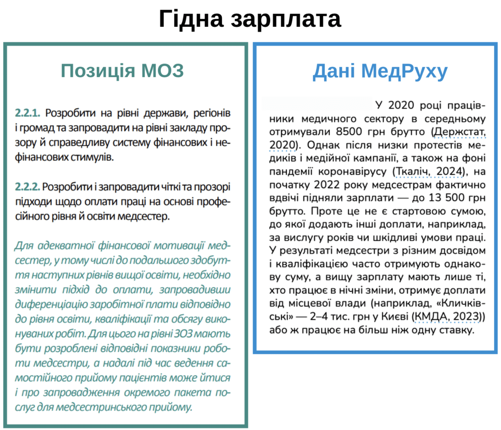 Таким чином МОЗ відверто ігнорує МедРух, який ще на початку свого створення в 2019 році вказував, що дерегуляція медсестринського догляду, закладена у другий етап медреформи, призведе саме до тих наслідків, які ми маємо зараз. Наприкінці нашого дослідження є ряд рекомендацій щодо того, як виправити положення медсестер.
