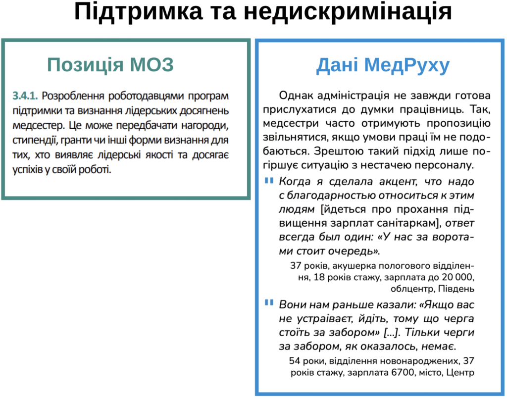 Натомість дослідження МедРуху зафіксувало цілий ряд випадків мобінгу на робочому місці, коли медсестри, які намагалися відстоювати свої права чи не погоджуватись з адміністрацією, стикалися з тиском та цькуванням.
