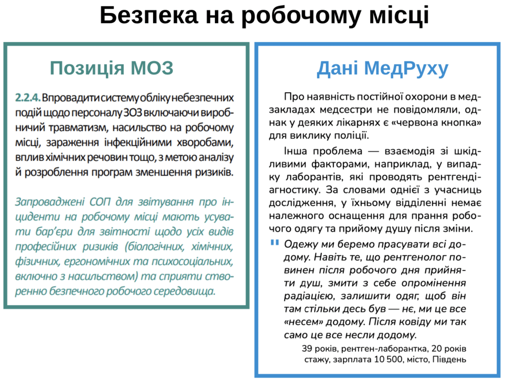 МОЗ вважає за необхідним “впровадити систему обліку небезпечних подій щодо персоналу ЗОЗ включаючи виробничий травматизм, насильство на робочому місці, зараження інфекційними хворобами, вплив хімічних речовин тощо, з метою аналізу й розроблення програм зменшення ризиків”.