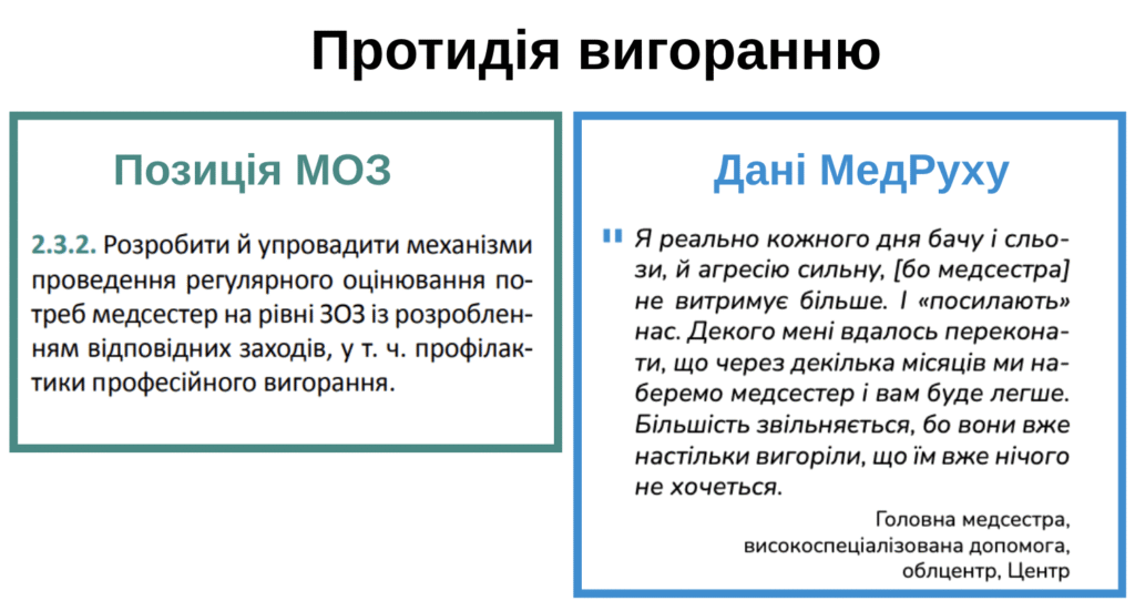 МОЗ рекомендує “розробити й упровадити механізми проведення регулярного оцінювання потреб медсестер на рівні ЗОЗ із розробленням відповідних заходів, у т. ч. профілактики професійного вигорання”.